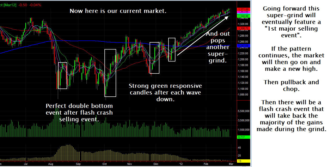 The pattern annotated below can be a regular occurrence when the daily is locked in a "super-grinder" auction higher (Even though the two examples are not entirely perfect.). If you don't know what structure this term implies, look at the current daily bar chart from now back to December 21, 2011. The young auction starts with elongated green bars and then morphs into a low volatility, grind higher that respects short-term moving averages. (Our current auction is almost two months in duration.)